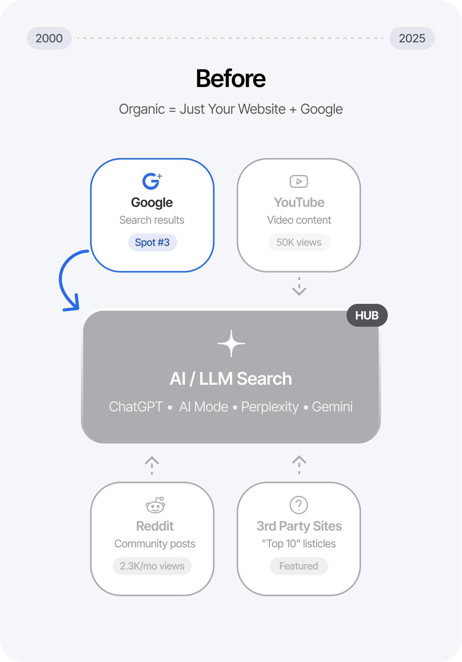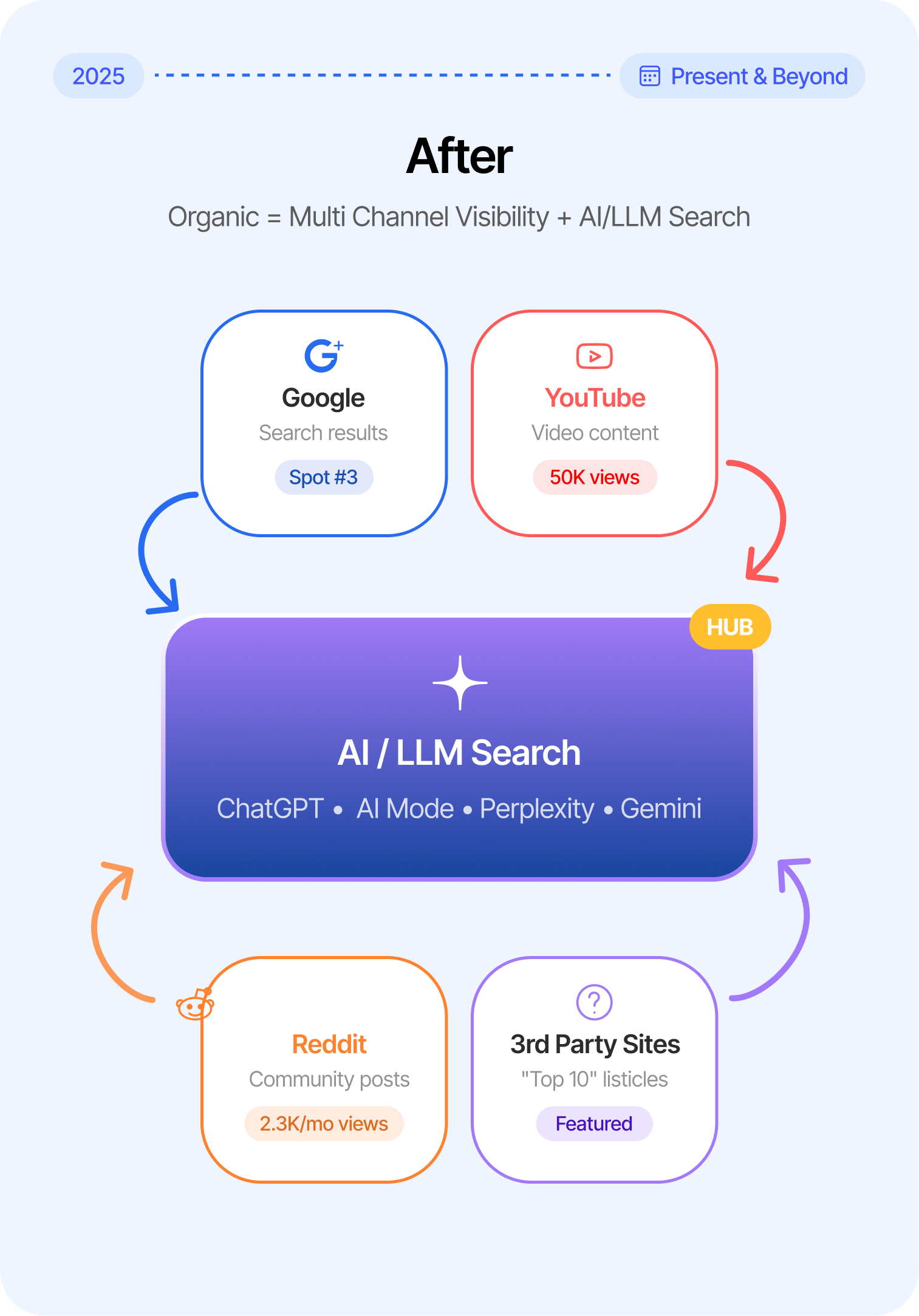 We monitor your presence across surfaces like Reddit, YouTube, AI Overviews, and organic Google. Then we refine your strategy to protect and expand your real estate.