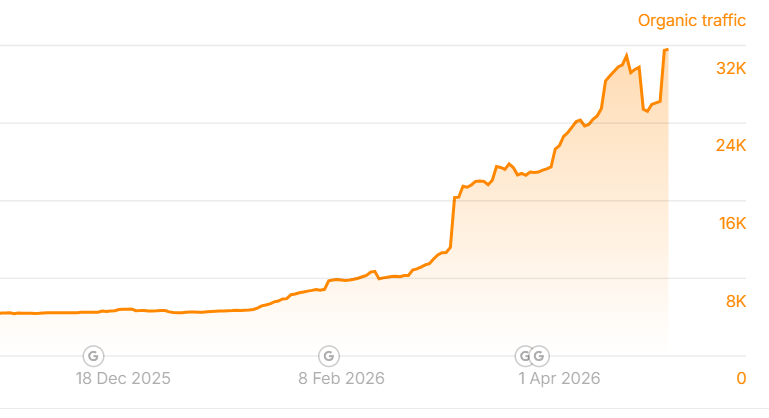 - 4,463 monthly traffic in Dec 2025 to 31,490 in April 2026