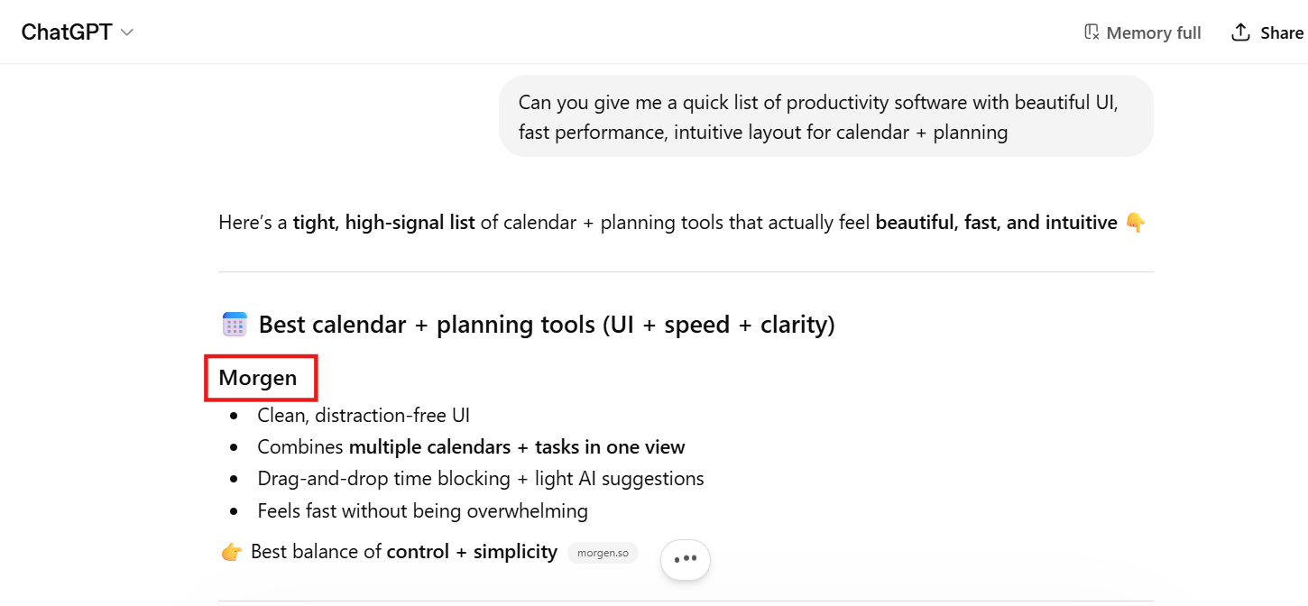 As a result, we saw a significant increase in AI search traffic, with signups following directly. Jim started having conversations with users who found Morgan through ChatGPT, Perplexity, and other AI tools.