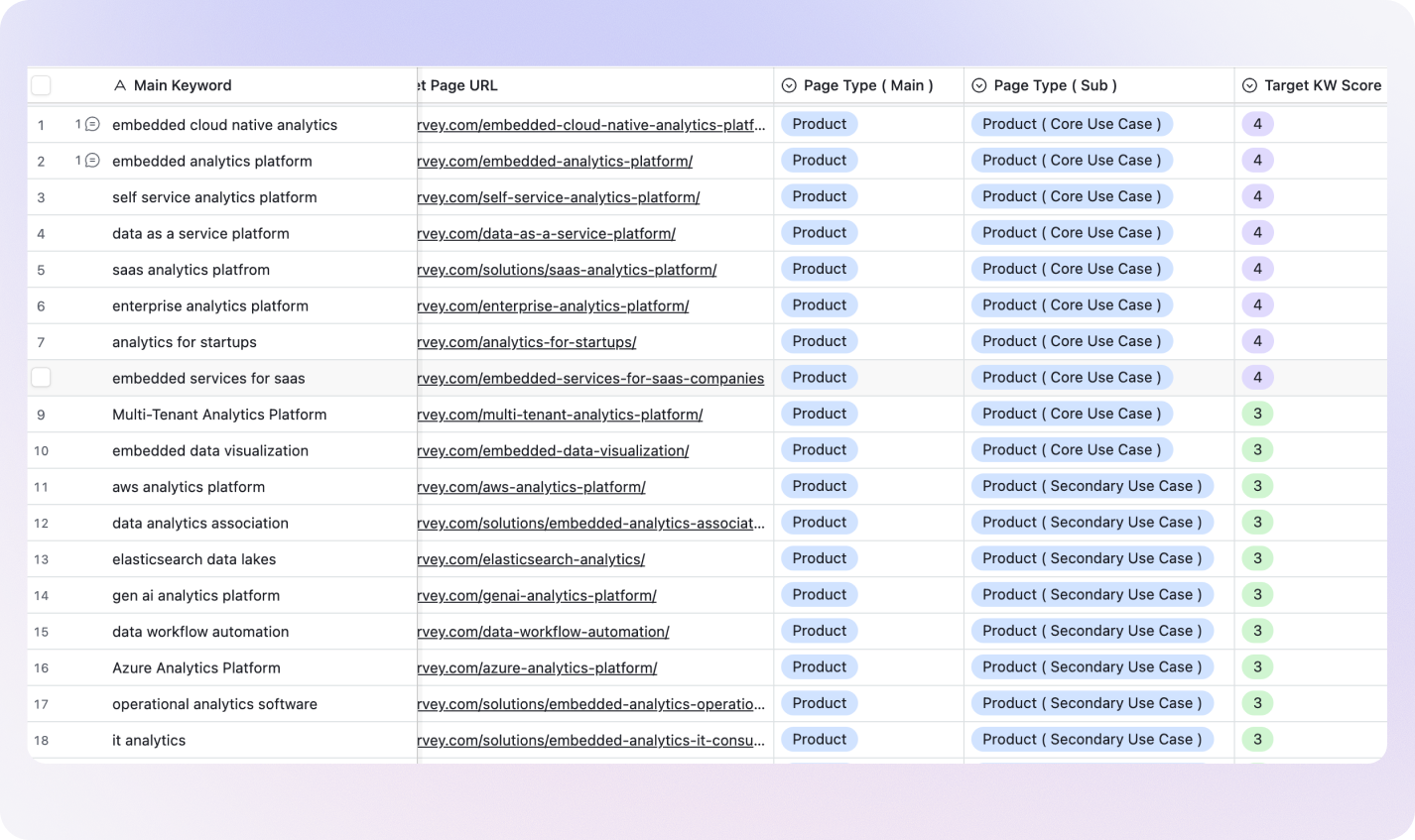 Qrvey operates in one of the most competitive corners of the analytics space. "Embedded analytics" is a high-competition keyword with limited search volume, and Qrvey only serves a subset of that market: SaaS companies specifically. So every keyword and every piece of content had to count.