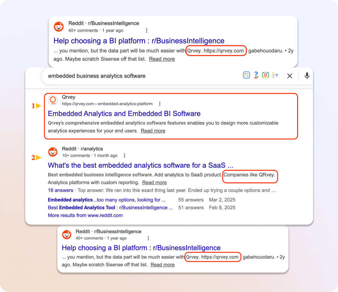 On Reddit, we targeted threads ranking for Qrvey's core category terms and placed the brand naturally into those conversations. We used employee accounts, joined discussions happening in their vertical, and provided genuine value before mentioning the product.