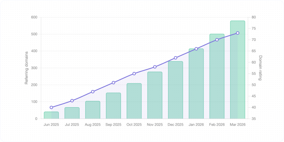 Referring domains and domain rating growth over time as link building scale up.